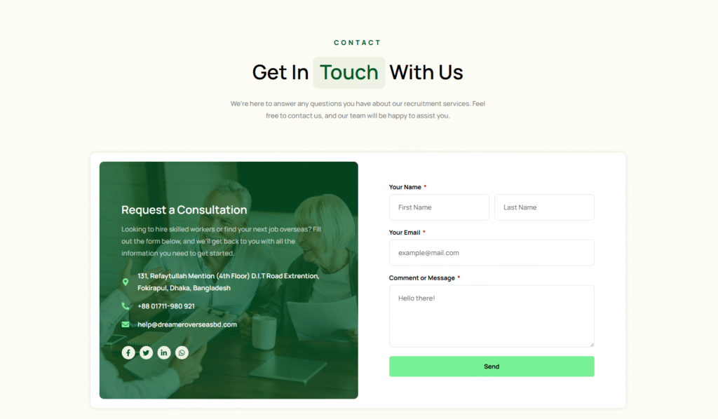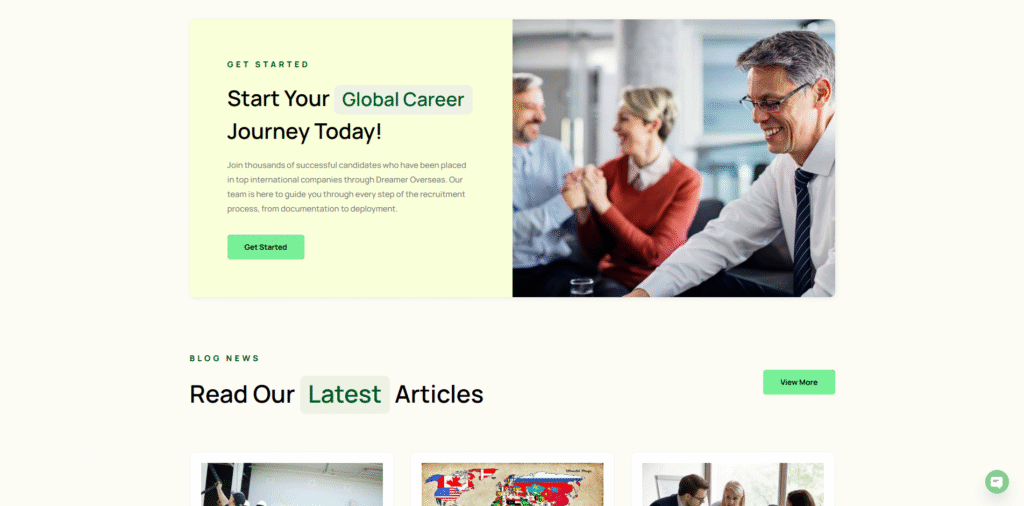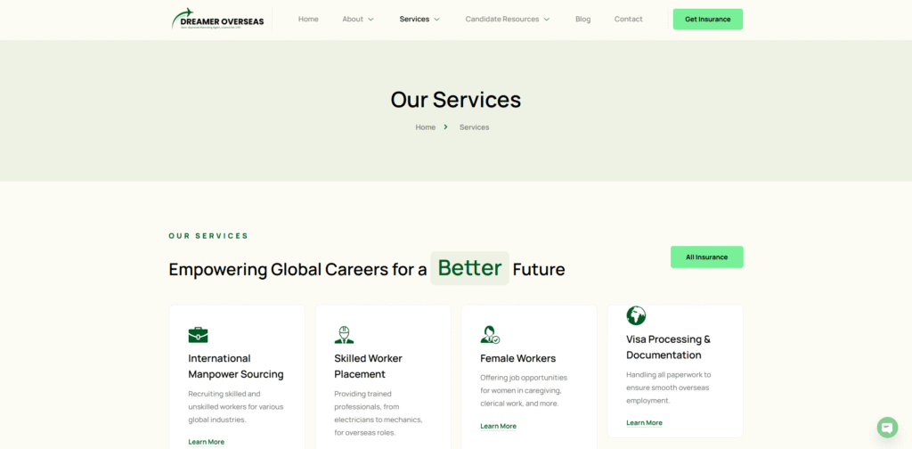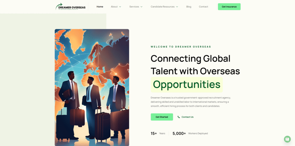 Developed a professional website for Dreamer Overseas, a government-approved international manpower recruitment agency. The project involved creating a platform that showcases their expertise in sourcing, training, and deploying skilled and unskilled workers to top global employers. The website highlights their comprehensive recruitment solutions, including candidate sourcing, visa processing, and post-deployment support. The design emphasizes their commitment to excellence, ethical practices, and strong partnerships with foreign employers, facilitating seamless talent matching and career opportunities for individuals.
